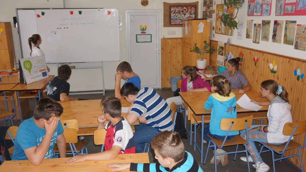 A csoportmunka során egymást segítve gyűjtöttek adatokat. Miután a 15 perces időkeret lejárt, visszamentünk a tantermünkbe, ahol a csapatokból 1-1 ember ismertette, mit tartottak fontosnak Nyíribrony történetéből, milyen nevezetességei vannak a falunak.